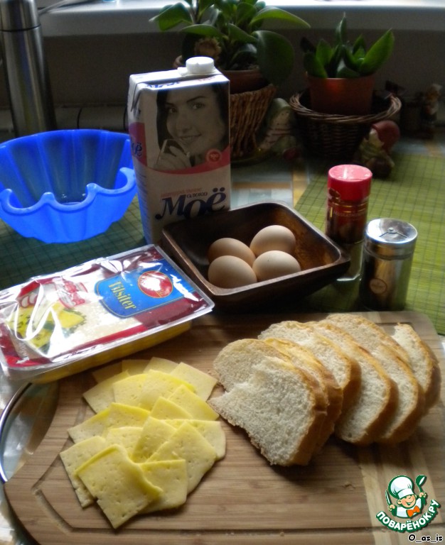 Все очень просто, быстро и вкусно! Батон нарезаем по половинке кольца, сыр на пластинки (у меня был Tilsiter и Gouda, и это плохо - надо бы тверже и менее жирный. В передаче сыр за 15 мин. готовки не успел сильно оплавиться, но подрумянился, мой же жирный до того, как зарумянился, уже весь потек и таких ажурных сырных лепестков, как на экране не случилось :\'( ). Продуктов брала меньше, из яиц - 1 яйцо и 3 белка, желтки отправила сюда: http://www.povarenok.ru/recipes/show/43594/ . Вот наши продукты, уже почти готовые.