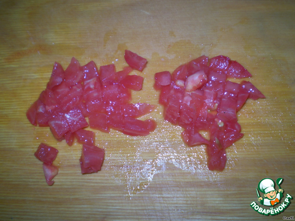 А тем временем снимаем кожицу с половины помидора и нарезаем небольшими кубиками