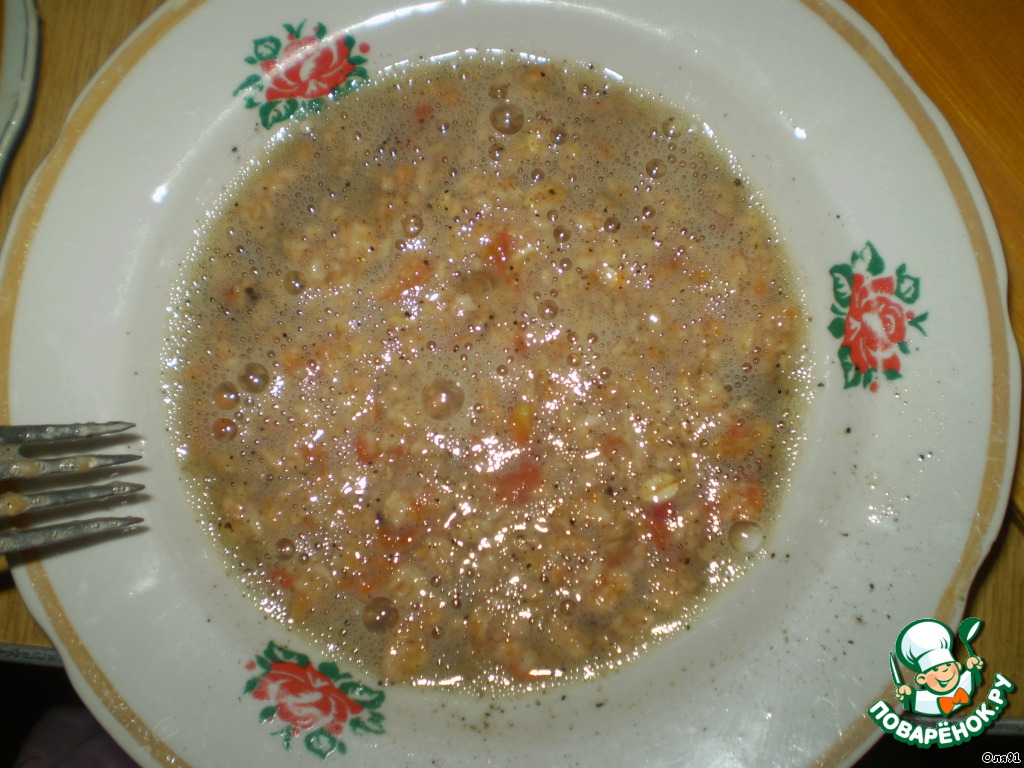В яйцо добавляем половину нашей остывшей смеси овсянки и помидора