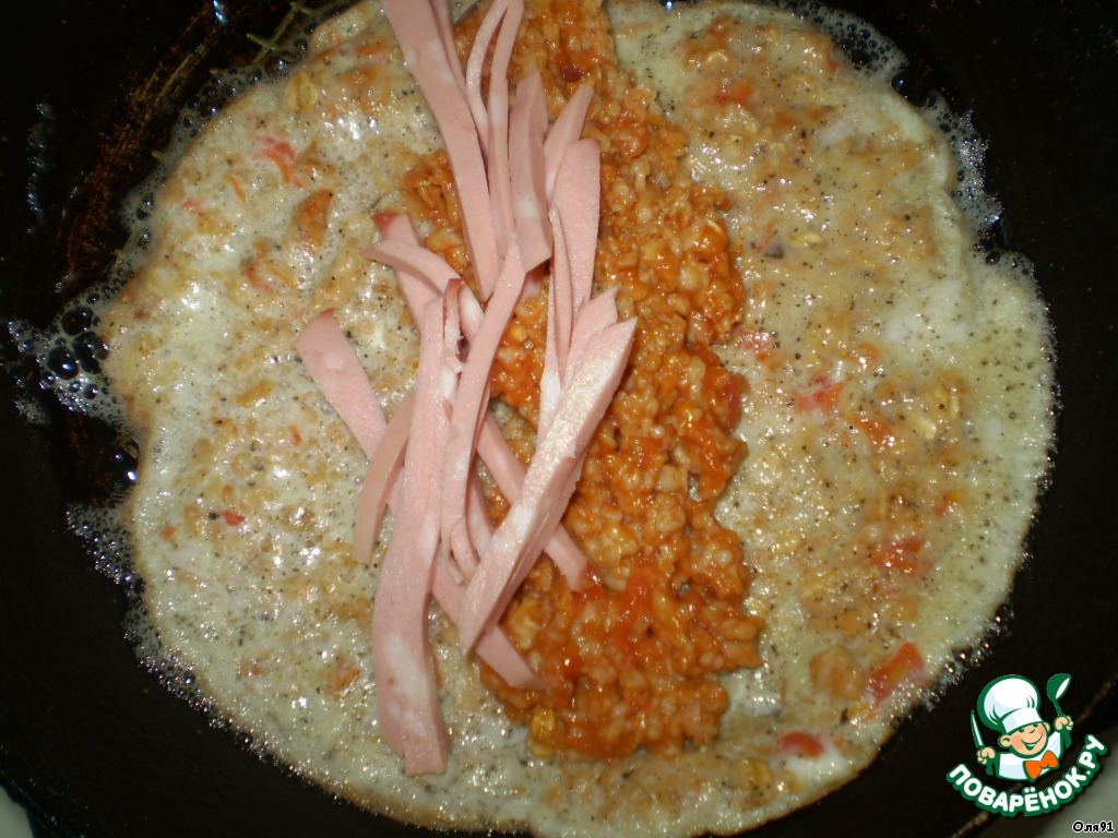 Выливаем наш "омлет" на сковороду, по середине выкладываем смесь и колбаску...