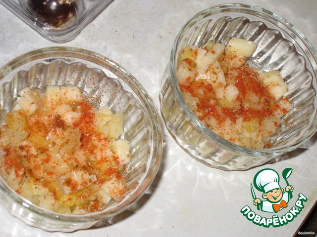 На дно формочек выложить ананас и сыр, сверху присыпать перцами и паприкой.