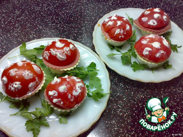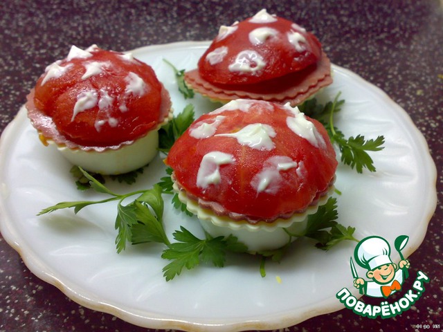 | В основе этих съедобных «мухоморчиков» – вареные яйца. Дети с удовольствием их поедают. |