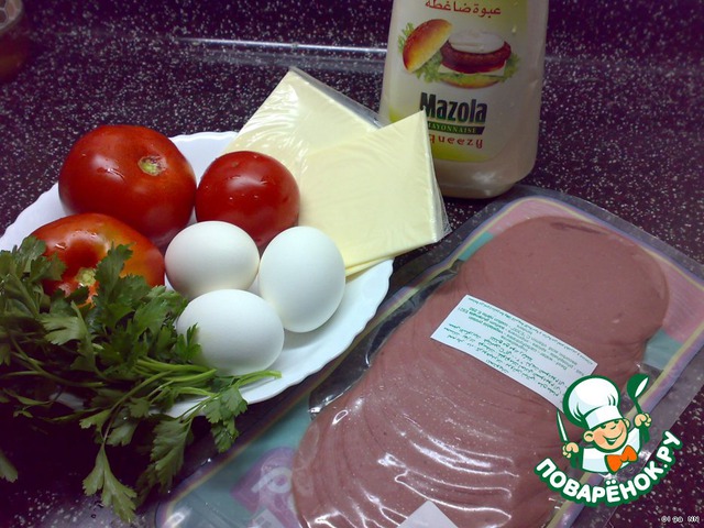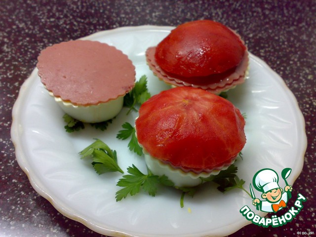 От помидоров отрезать кружочки с боков. Все это уложить сверху на яйца: сначала сыр с колбасой, а сверху – помидоры. Чтобы лучше держались, срезать с яиц верхушки.