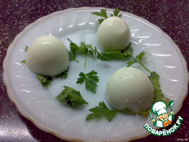 Яйца сварить вкрутую, остудить в холодной воде. Очистить и разрезать поперек на две части, посолить и поставить на плоскую тарелку или блюдце, посыпанные петрушкой (травка).