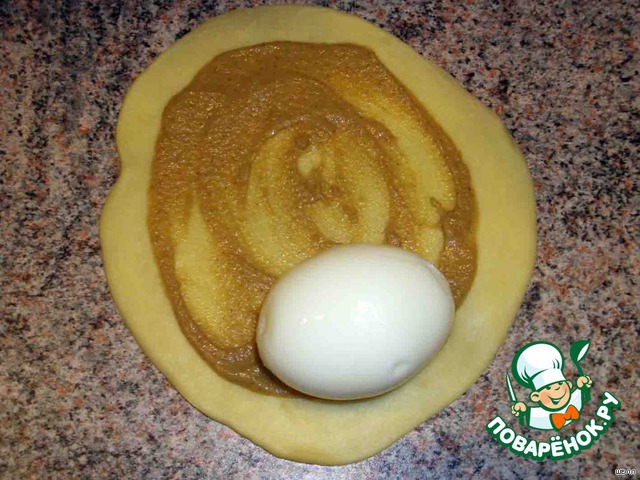 Достаем наше тесто и делим на 6 порций, 5 из которых раскатываем в виде прямоугольников (или что-то похожее))))) размером, где-то 12х17 см. Намазываем тесто горчицей и заворачиваем в каждый прямоугольник по яйцу.