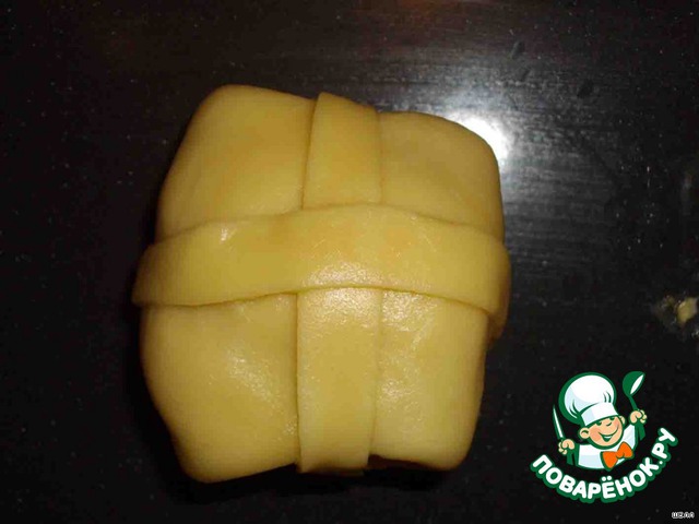 Шестую часть теста раскатываем и нарезаем на 10 одинаковых полосок. Крестообразно обвязываем ими наши рулетики. Вот такие симпатяги должны получиться. Выкладываем их на противень, застеленный бумагой.