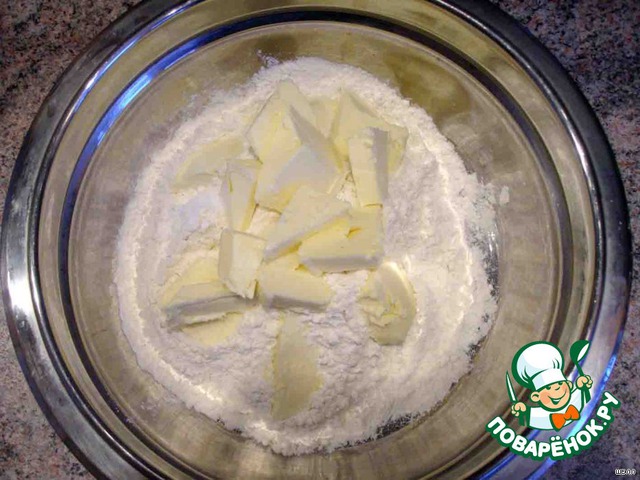 Делаем тесто: насыпаем в миску муку, добавляем сливочное масло и воду. Вымешиваем гладкое тесто, оно не должно приставать к рукам (при необходимости добавляем немного муки).