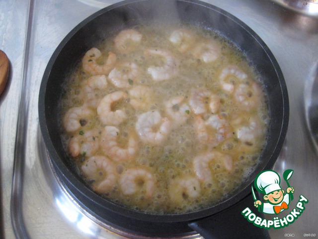 На хорошо разогретой сковороде,с добавлением растительного масла, обжарить креветки с чесноком (2-3 мин).