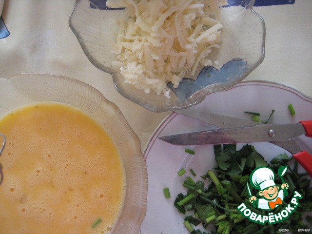 Зелень и чеснок измельчить, сыр натереть, яйца взбить, добавить соль, перец и столько же молока.