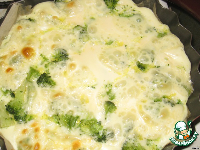 Заливаем взбитыми яйцами брокколи. Нарезаем моцареллу тонкими пластинками и выкладываем сверху.