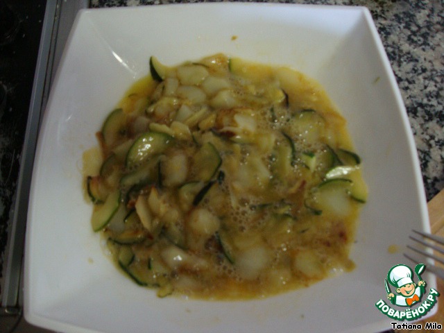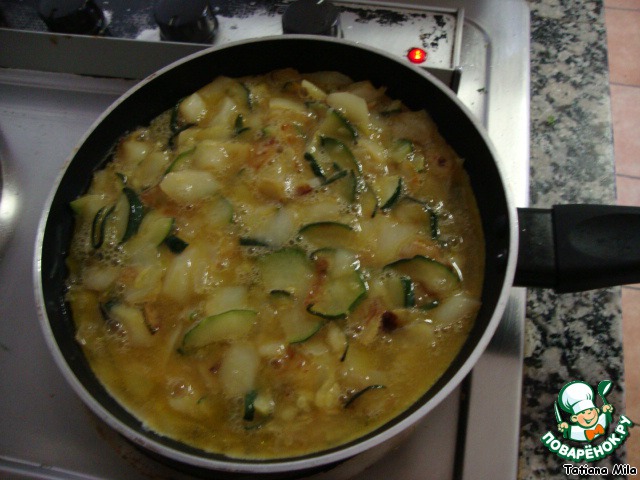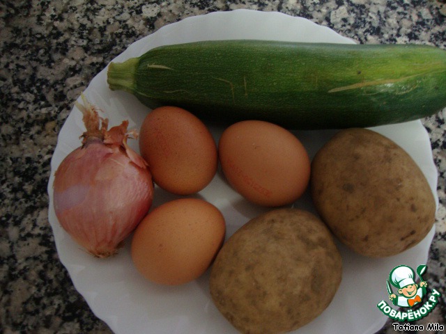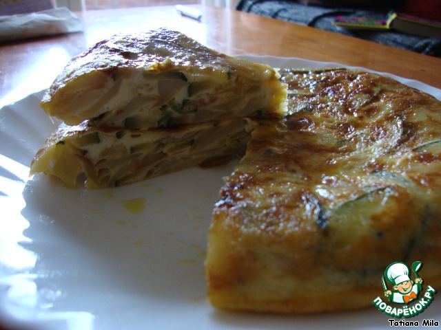 | Это, как мне кажется, самая популярная испанская закуска. Оригинальный рецепт ее не содержит кабачок, только картошку, лук и яйца. А вообше, они омлет делают из всего, что есть под рукой (так что, добавив кабачок, я омлетик не испортила:)), и обязательно обжаривают с двух сторон. Это простое, сытное, недорогое блюдо, я думаю, многим придется по душе. |
