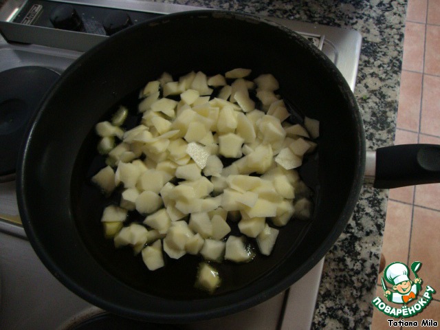 картошечку нарезаем маленькими кусочками, промываем. На большую сковороду наливаем оливкового масла, разогреваем и добавляем картошку