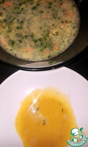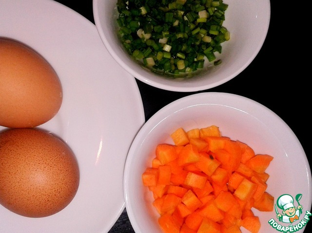 Разбиваем три яйца (извините, на фото два) в миску, солим, перчим по вкусу, размешиваем, не взбиваем, в блюдце отливаем 3 ст. л. яичной смеси, отставляем в сторону. Морковку режем маленькими кубиками, лук мелко шинкуем.