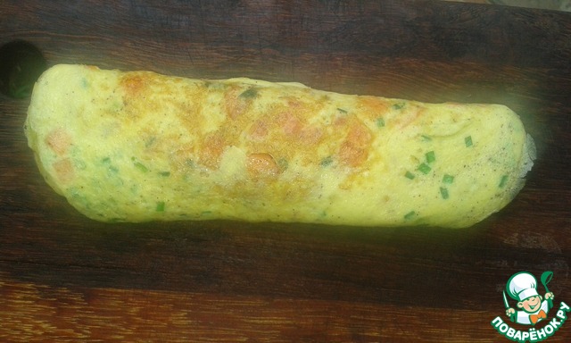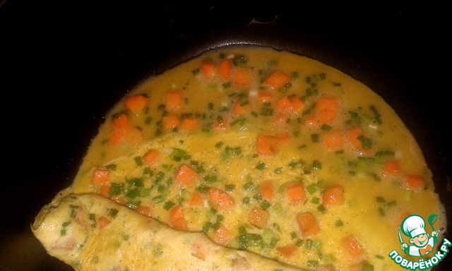 Для жарки лучше использовать блинную сковороду или с невысокими бортиками. Ставим на медленный огонь, смазываем маслом и половником выливаем смесь, как готовим обычный омлет, но тонкий. Вровень с морковкой. Когда немного схватится снизу, а сверху будет ещё немного жидкий, начинаем сворачивать и каждый раз прижимаем лопаткой, нам он нужен овальной формы, а не круглой. Докрутили до середины.