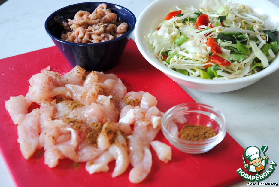 Подготовить ингредиенты для омлета: куриное мясо нарезать небольшими кусочками, овощи - у меня готовая смесь – тоже тонко нарезать. Креветки, если требуется, разморозить и измельчить. У меня охлажденные маленькие креветки из Северного моря, местное лакомство. Они неприглядны, но очень вкусны. Куриное мясо посолить, поперчить, можно добавить китайскую смесь из 5 пряностей, но можно и без нее.