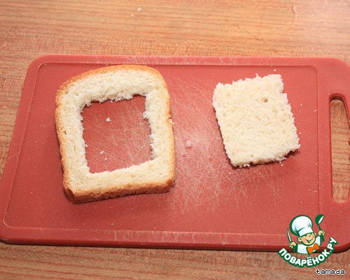 Берем хлеб для тостов, вырезаем ножом серединку так, чтобы осталась "рамка" со стенками не толще 1 см