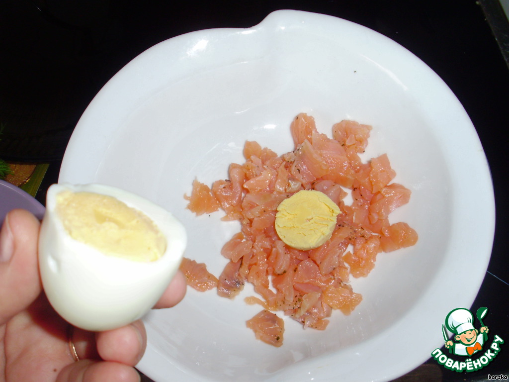 Итак, обратно к рецепту. Сёмгу нарезать кубиками. Яйца очистить, разрезать на половинки, желтки добавить к сёмге.