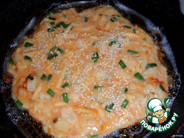 Жарим, посыпав кунжутом, с одной стороны, потом складываем.