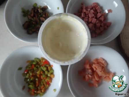 Я обжарила шампиньоны с луком-пореем, перец болгарский с луком-пореем. Нарезала на маленькие кусочки семгу слабосоленую. И также сосиску для деток.