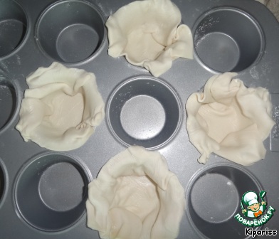 Тесто разморозить и нарезать на квадраты 10 на 10 см, с одной стороны хорошо присыпать мукой.