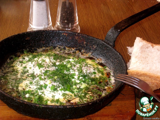 После того, как сметана закипит, осторожно (не повредив желток)вбиваем в нее яйца. НЕ ПЕРЕМЕШИВАТЬ! Солим и перчим по вкусу.