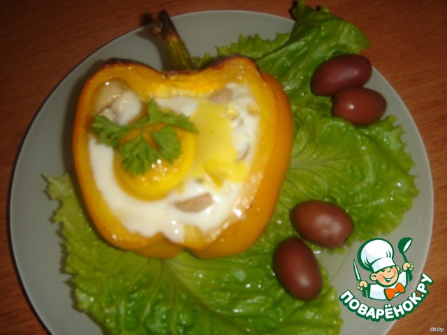 В каждый перец вбить по яйцу и поставить запекаться в разогретую духовку при температуре 180-200 градусов на 20 минут. Если сверху перцы начнут гореть, накрыть фольгой.