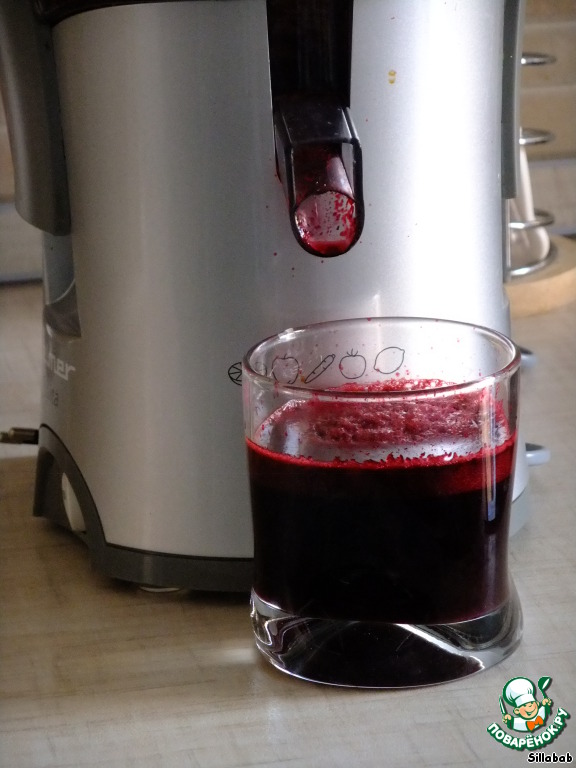 Яйца отвариваем вкрутую. Пока идет процесс варки, выжимаем сок свеклы. Из трех небольших свеколок у меня получилось вот такое количество сока. Я добавила немного воды, чтобы получить полный стакан.