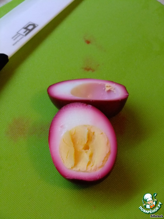 После охлаждения сливаем маринад и режем яйца пополам, желтки складываем в отдельную миску.