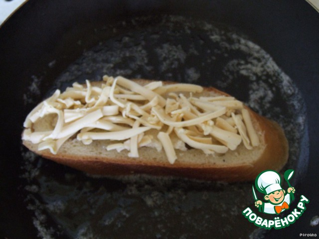 Посыпаем тертым сыром и кладем на сковороду с разогретым сливочным маслом. Жарим на маленьком огне под закрытой крышкой до готовности яйца.