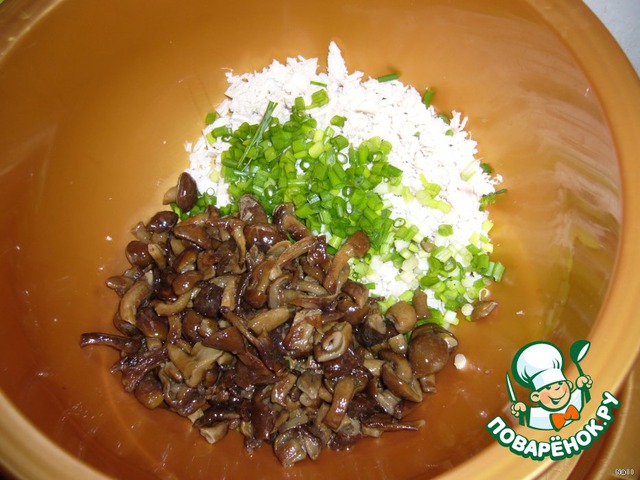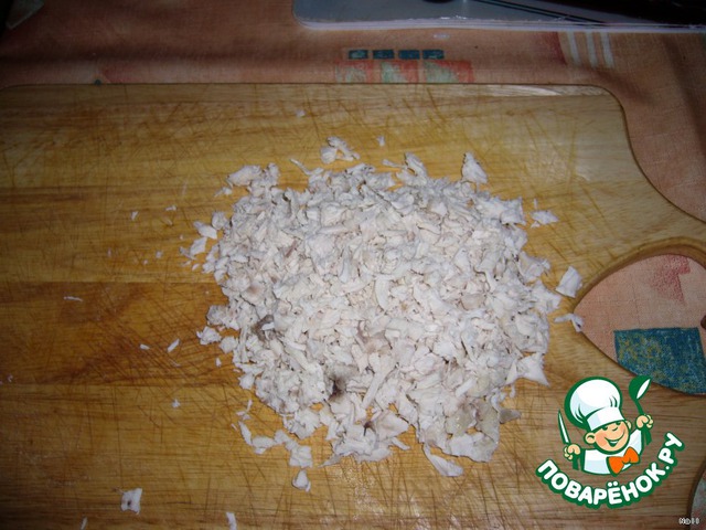 Пока опята охлаждаются, нарезаем как можно мельче отваренную куриную грудку и...