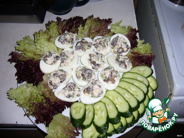 на тарелку выкладываем листья салата и нарезанный дольками огурец, яйца чистим, разрезаем пополам (вдоль), вынимаем желток и чайной ложечкой выкладываем на его место получившуюся у нас начинку. Приятного аппетита!!!