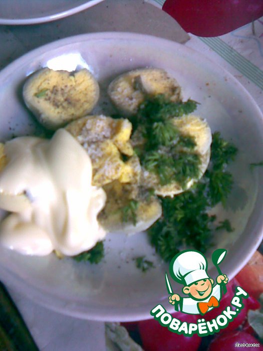 яйца отварить, разрезать пополам, вынуть желтки. Желтки растереть с майонезом, измельченным укропом, соль, перец. В принципе, начинка может быть любой.