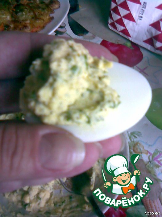 смазать каждый квадрат горчицей,положить в центр фаршированное яйцо