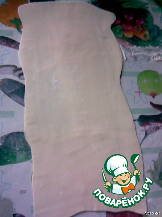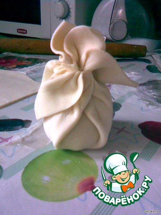 собрать из теста "узелок". Выложить на смоченный холодной водой противень, смазать яйцом. Выпекать в разогретой духовке при температуре 200, 10 мин.