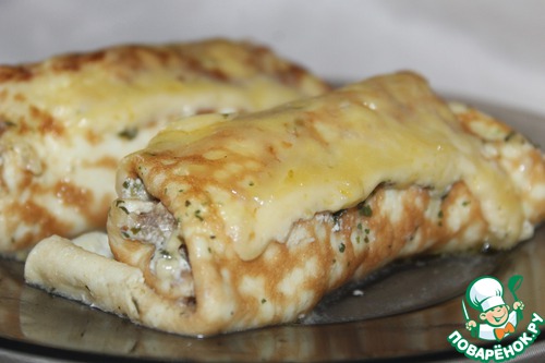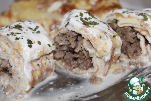 На готовый яичный блин выкладываем немного фарша и закручиваем (как голубцы)