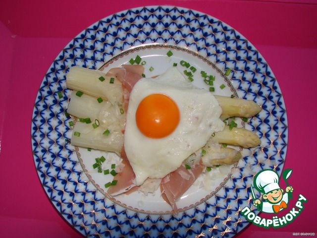 Очистить и отварить спаржу, как описано в рецепте "Белая спаржа - секреты приготовления" http://www.povarenok.ru/recipes/show/25547/