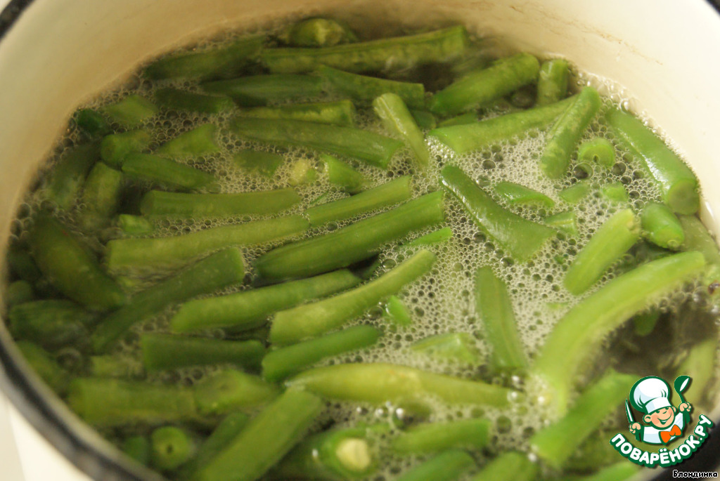 Замороженную фасоль (я использовала примерно четверть четырехсот граммового пакета) опускаем в кипящую подсоленую воду и отвариваем буквально 2 минутки. Откидываем на дуршлаг и обдаем ледяной водой