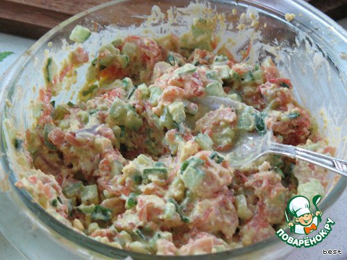 Огурец и филе лосося нарезать мелкими кубиками.