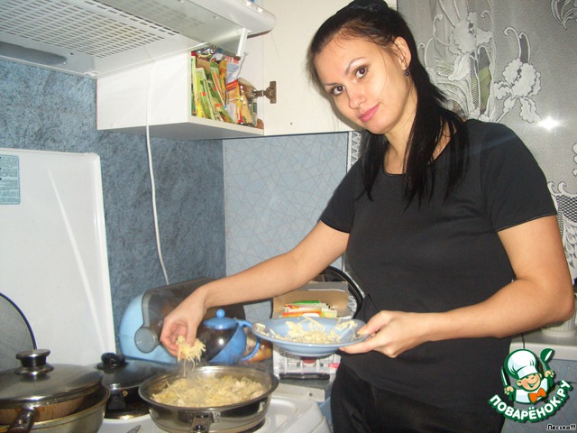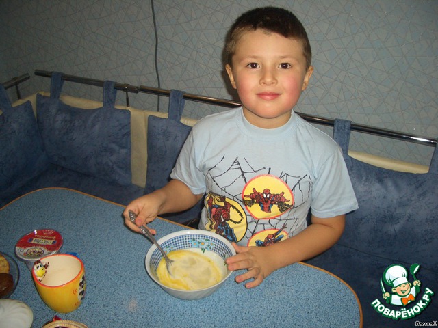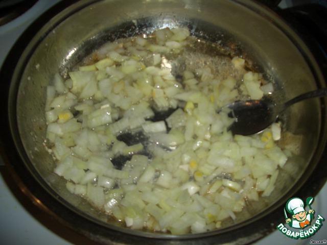 Добавляем его к луку и обжариваем до румяного цвета. Пока он жарится - яйца взбалтываем с молоком, солью, перцем и мускатным орехом. Это сделал сынок.