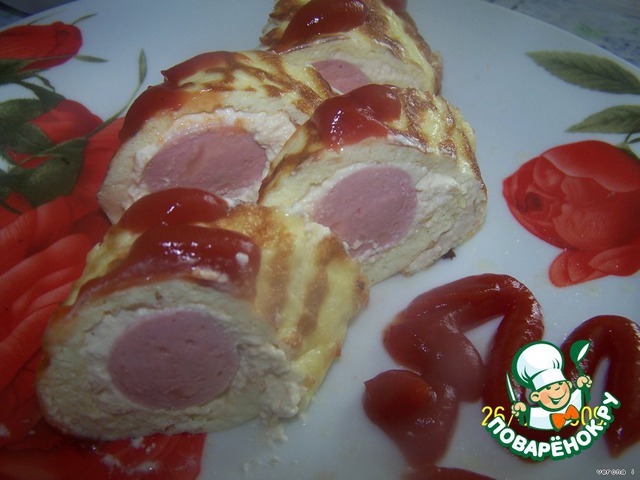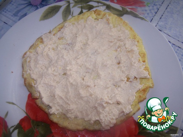 Яйца взбить, добавить молоко и выпечь два омлетика.