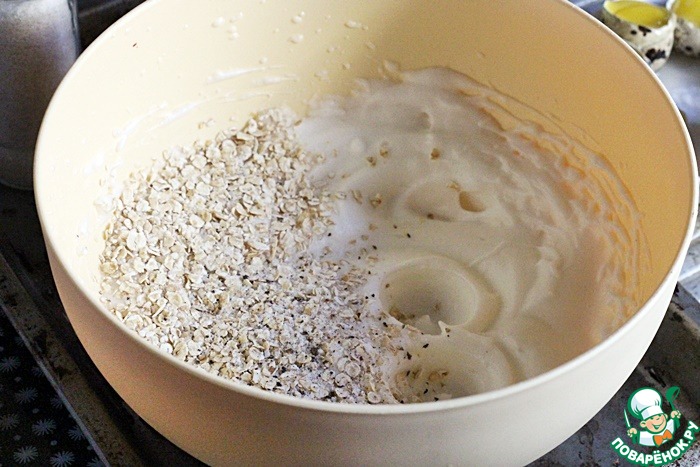 Белки взбить до устойчивых пиков, добавить соль, молотый перец и хлопья. Аккуратно перемешать, снизу в верх, чтобы не нарушить пышность белков.