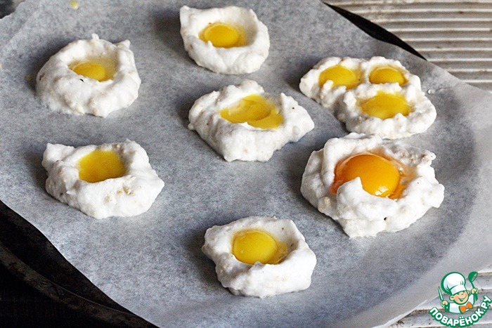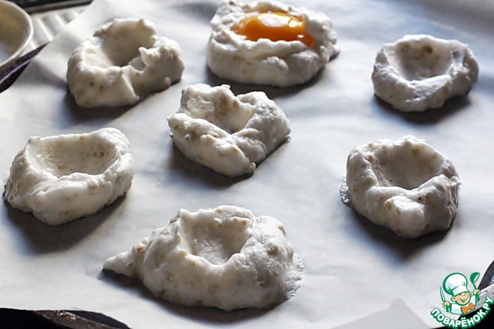 В середину выложить желток. На этом этапе можно добавить любую начинку (мелконарезанные овощи, кусочки ветчины или на ваш вкус).