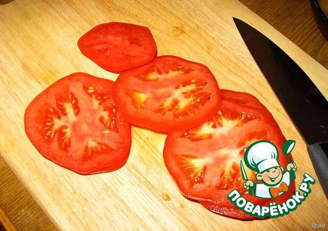 Помидор нарезать пластинками, кругов 4-6 надо.