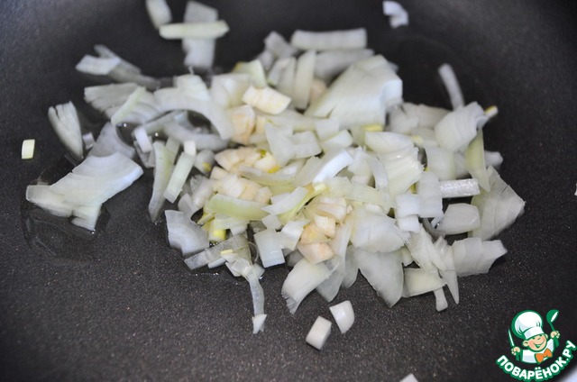 На сковороду наливаем оливковое масло, кладём порезанный кубиками лук и чеснок, обжариваем до прозрачности пару минут.