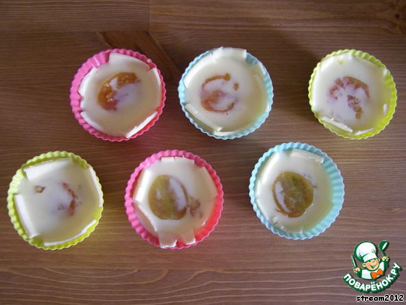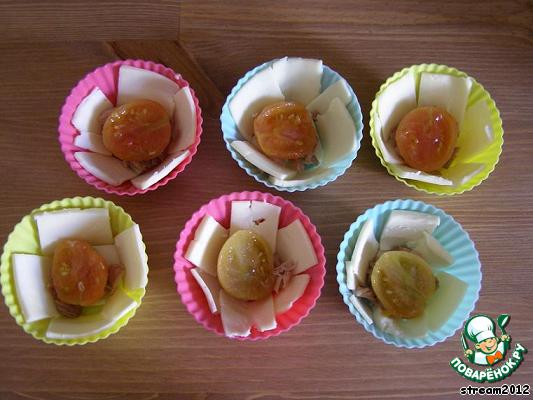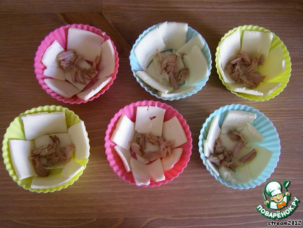 Тонкими пластинами нарезаем сыр. Выкладываем сыр в формочки в виде цветочка.