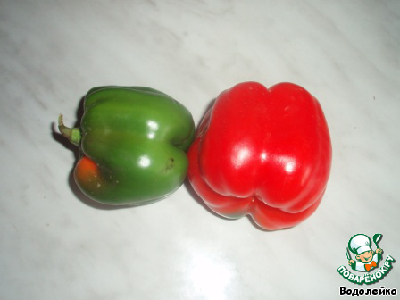 Берем наши перчики (у меня были только зеленый и красный, а вот если бы еще и желтый....), хорошо моем их, срезаем верхушку(там, где хвостик), аккуратно удаляем серединку (т.е семена) и еще раз промываем.