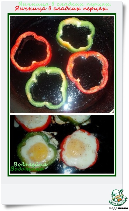 | Хочу предложить вам вариант самой простой яичницы-глазуньи, но с подачей... в болгарском перце. Этот вариант очень хорошо подойдет для завтрака. Делается быстро и просто. А если перчики разноцветные, то получается еще и очень красиво. |