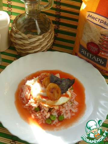 В готовый рис с горошком добавить 3-4 ст. л. томатного соуса, перемешать и выложить на тарелку
