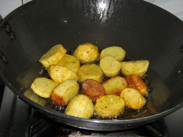Картофель порезать на крупные кусочки - полукругляши. Обжарить в сковороде до корочки, вынуть.
