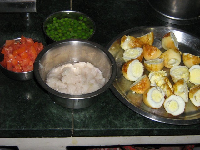 Следующим обжарить горошек, вынуть. Порезать мелко помидоры, подготовить чесночно-имбирную пасту, сделать в миксере пасту из лука, яйца разрезать на половинки.